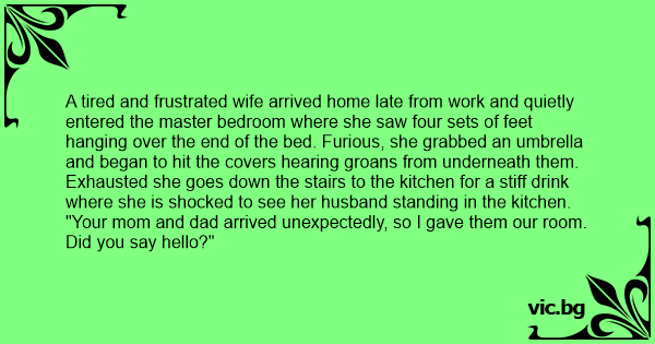 A tired and frustrated wife arrived home late from work and quietly entered the master bedroom where she saw four sets of feet hanging over the end of the bed. Furious, she grabbed an umbrella and began to hit the covers hearing groans from underneath them.