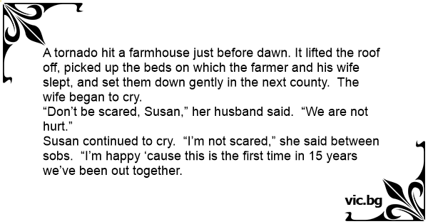 A tornado hit a farmhouse just before dawn. It lifted the roof off, picked up the beds on which the farmer and his wife slept, and set them down gently in the next county. The wife began to cry.