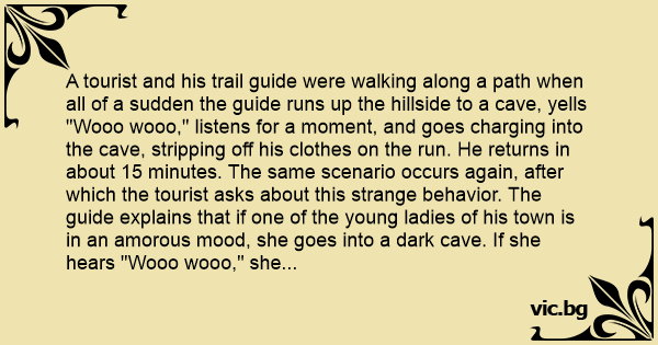 A tourist and his trail guide were walking along a path when all of a sudden the guide runs up the hillside to a cave, yells "Wooo wooo," listens for a moment, and goes charging into the cave, stripping off his clothes on the run. He returns in about 15 minutes. The same scenario occurs again, after which the tourist asks about this strange behavior. The guide explains that if one of the young ladies of his town is in an amorous mood, she goes into a dark cave. If she hears "Wooo wooo," she responds "Wooo wooo" to signal that she is ready and willing. No one knows who is who and everyone is happy.