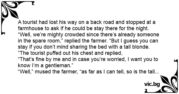 “Well, we’re mighty crowded since there’s already someone in the spare room,” replied the farmer. “But I guess you can stay if you don’t mind sharing the bed with a tall blonde.