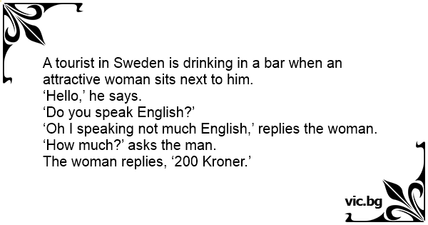 A tourist in Sweden is drinking in a bar when an attractive woman sits next to him.