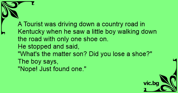 A Tourist was driving down a country road in Kentucky when he saw a little boy walking down the road with only one shoe on.