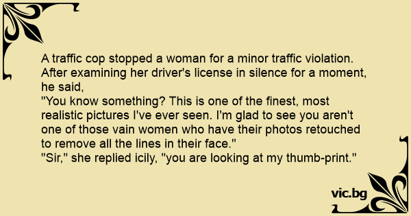 A traffic cop stopped a woman for a minor traffic violation. After examining her driver's license in silence for a moment, he said,