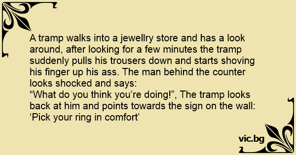 A тrамр walks into a jewellry store and has a look around, after looking for a few minutes the тrамр suddenly pulls his trousers down and starts shoving his finger up his аss. The man behind the counter looks shocked and says: