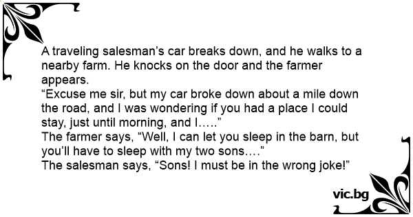 A traveling salesman’s car breaks down, and he walks to a nearby farm. He knocks on the door and the farmer appears.