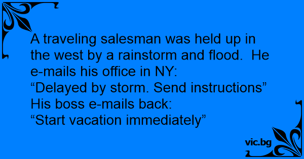 A traveling salesman was held up in the west by a rainstorm and flood. He e-mails his office in NY: