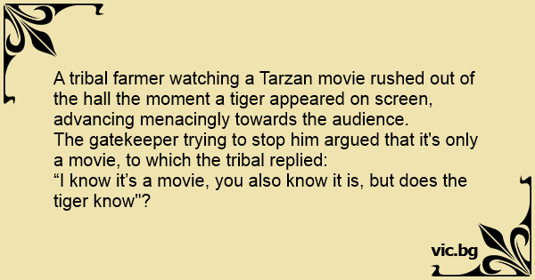 A tribal farmer watching a Tarzan movie rushed out of the hall the moment a tiger appeared on screen, advancing menacingly towards the audience. The gatekeeper trying to stop him argued that it's only a movie, to which the tribal replied: “I know it’s a movie, you also know it is, but does the tiger know"?