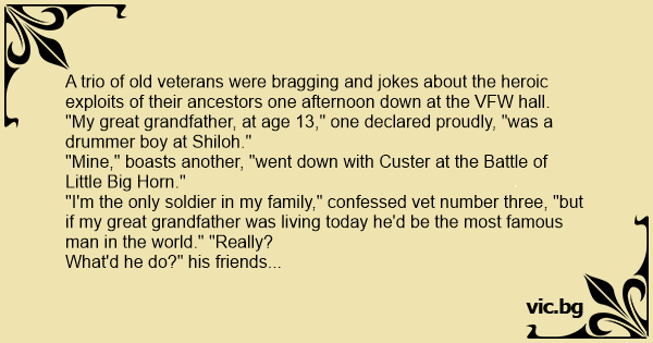 A trio of old veterans were bragging and jokes about the heroic exploits of their ancestors one afternoon down at the VFW hall.