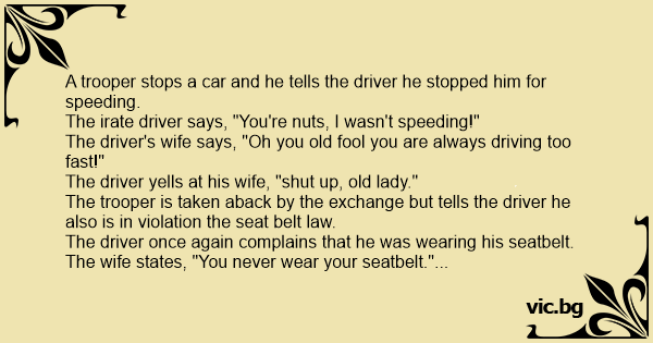 The driver's wife says, "Oh you old fool you are always driving too fast!"