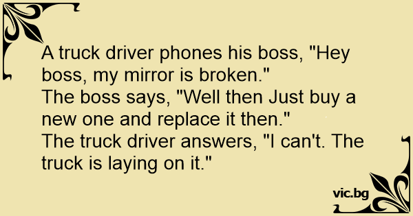 A truck driver phones his boss, "Hey boss, my mirror is broken."
