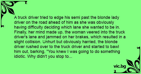 A truck driver tried to edge his semi past the blonde lady driver on the road ahead of him as she was obviously having difficulty deciding which lane she wanted to be in. Finally, her mind made up, the woman veered into the truck driver's lane and jammed on her brakes, which resulted in a slight collision. Unhurt but obviously harried, the blonde driver rushed over to the truck driver and started to bawl him out, barking, "You knew I was going to do something idiotic. Why didn't you stop to wait and see what it was?"