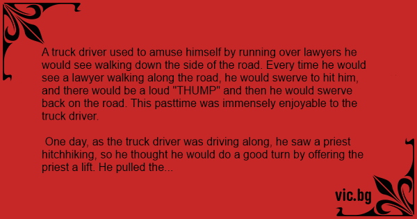 With that, the happy priest climbed into the passenger seat, and the truck driver continued down the road. Suddenly, the truck driver saw a lawyer walking down the road, and instinctively he swerved to hit him.
