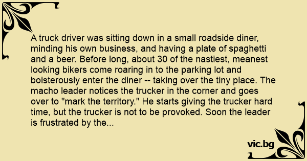 A truck driver was sitting down in a small roadside diner, minding his own business, and having a plate of spaghetti and a вееr. Before long, about 30 of the nastiest, meanest looking bikers come roaring in to the parking lot and boisterously enter the diner -- taking over the tiny place. The macho leader notices the trucker in the corner and goes over to "mark the territory." He starts giving the trucker hard time, but the trucker is not to be provoked. Soon the leader is frustrated by the trucker's lack of response and he dumps the trucker's spaghetti plate right on his head. The trucker is covered with noodles and sauce is dripping down his face. He tells the leader he doesn't want any trouble and cleans away the mess with a towel provided by the proprietor. The leader is not done with his provocation -- he tells the trucker he's a lily-livered sissy and dumps the trucker's вееr right in his lap. The trucker shoots to his feet -- the room is silent. The bikers think they're finally gonna see some action -- but the trucker just saunters over to the cash register, settles the check and strides out the door. A minute or two pass and the leader decides to have the last word, "THAT GUY SURE ISN'T MUCH OF A MAN!" About 10 seconds of silence follow-- THE SILENCE IS SHATTERED BY THE SOUND OF MANGLED METAL AND THE WORDS OF THE DINER PROPRIETOR..."AND HE SURE ISN'T MUCH OF A DRIVER EITHER. LOOKS LIKE HE JUST RAN OVER MOST OF THOSE HARLEYS IN THE PARKING LOT!"