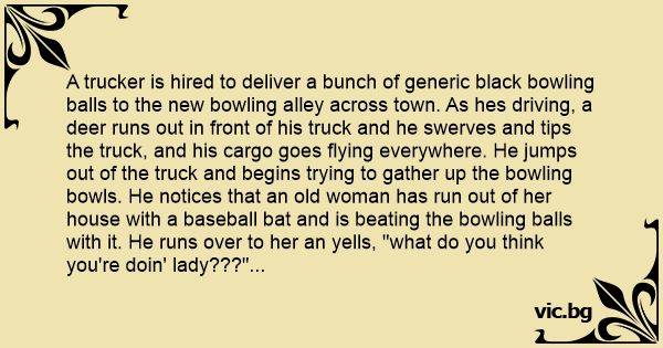 A trucker is hired to deliver a bunch of generic black bowling ваlls to the new bowling alley across town. As hes driving, a deer runs out in front of his truck and he swerves and tips the truck, and his cargo goes flying everywhere. He jumps out of the truck and begins trying to gather up the bowling bowls. He notices that an old woman has run out of her house with a baseball bat and is beating the bowling ваlls with it. He runs over to her an yells, "what do you think you're doin' lady???" and she screams in distress, "I'm breaking them before they hatch."