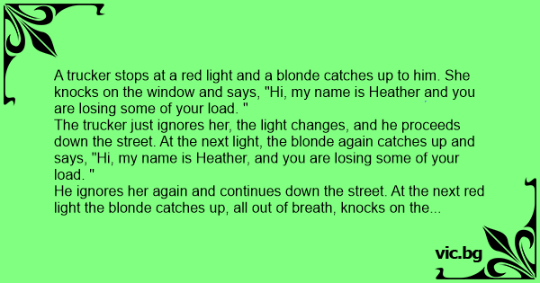 The trucker just ignores her, the light changes, and he proceeds down the street. At the next light, the blonde again catches up and says, "Hi, my name is Heather, and you are losing some of your load. "