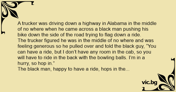 The trucker figured he was in the middle of no where and was feeling generous so he pulled over and told the black guy, “You can have a ride, but I don’t have any room in the cab, so you will have to ride in the back with the bowling ваlls. I’m in a hurry, so hop in.”