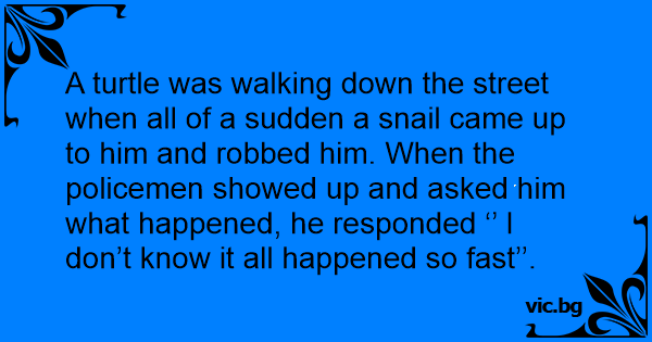 A turtle was walking down the street when all of a sudden a snail came up to him and robbed him. When the policemen showed up and asked him what happened, he responded ‘’ I don’t know it all happened so fast’’.