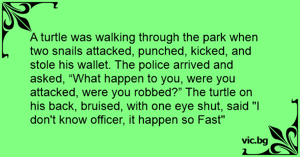 A turtle was walking through the park when two snails attacked, punched, kicked, and stole his wallet. The police arrived and asked, “What happen to you, were you attacked, were you robbed?” The turtle on his back, bruised, with one eye shut, said "I don't know officer, it happen so Fast"