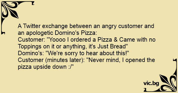 Customer (minutes later): "Never mind, I opened the pizza upside down :/"
