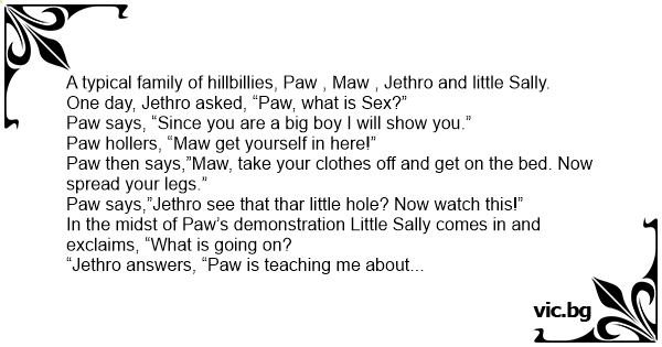 Paw then says,”Maw, take your clothes off and get on the bed. Now spread your legs.”