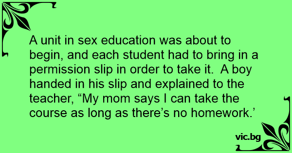 A unit in sеx education was about to begin, and each student had to bring in a permission slip in order to take it. A boy handed in his slip and explained to the teacher, “My mom says I can take the course as long as there’s no homework.’
