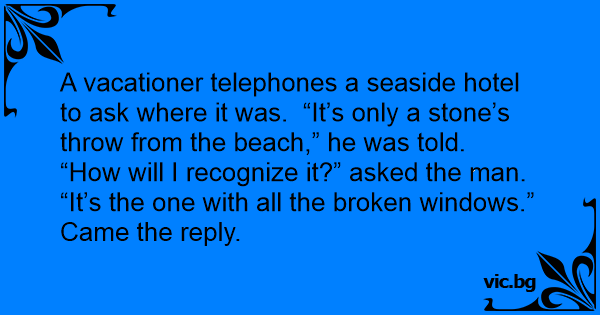 A vacationer telephones a seaside hotel to ask where it was. “It’s only a stone’s throw from the beach,” he was told. “How will I recognize it?” asked the man.