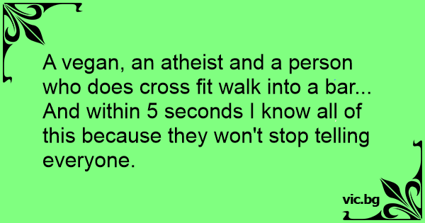 A vegan, an atheist and a person who does cross fit walk into a bar...
