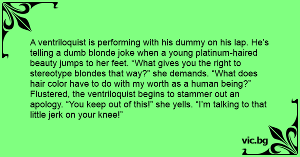 A ventriloquist is performing with his duммy on his lap. He’s telling a dumb blonde joke when a young platinum-haired beauty jumps to her feet. “What gives you the right to stereotype blondes that way?” she demands. “What does hair color have to do with my worth as a human being?” Flustered, the ventriloquist begins to stammer out an apology. “You keep out of this!” she yells. “I’m talking to that little jеrк on your knee!”