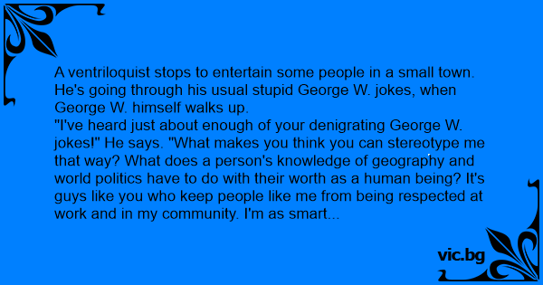 A ventriloquist stops to entertain some people in a small town. He's going through his usual sтuрid George W. jokes, when George W. himself walks up.