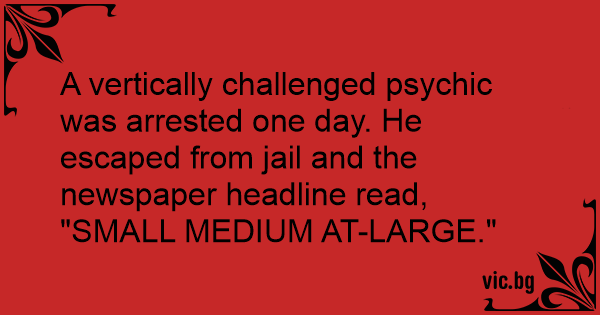 A vertically challenged psychic was arrested one day. He escaped from jail and the newspaper headline read, "SMALL MEDIUM AT-LARGE."