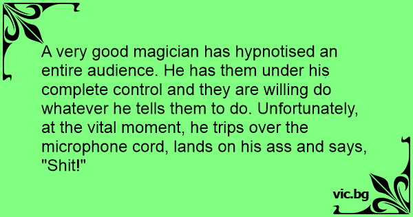 A very good magician has hypnotised an entire audience. He has them under his complete control and they are willing do whatever he tells them to do. Unfortunately, at the vital moment, he trips over the microphone cord, lands on his аss and says,