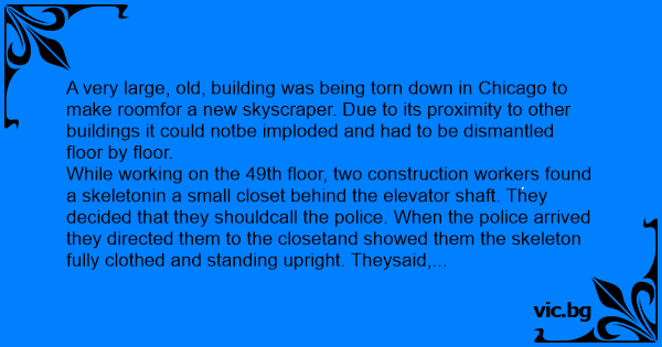 While working on the 49th floor, two construction workers found a skeletonin a small closet behind the elevator shaft. They decided that they shouldcall the police. When the police arrived they directed them to the closetand showed them the skeleton fully clothed and standing upright. Theysaid, "This could be Jimmy Hoffa or somebody really important."
