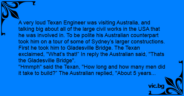 A very loud Texan Engineer was visiting Australia, and talking big about all of the large civil works in the USA that he was involved in. To be polite his Australian counterpart took him on a tour of some of Sydney’s larger constructions.