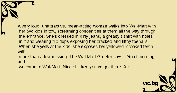 A very loud, unattractive, mean-acting woman walks into Wal-Mart with