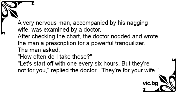 "Let's start off with one every six hours. But they're not for you," replied the doctor. "They're for your wife."