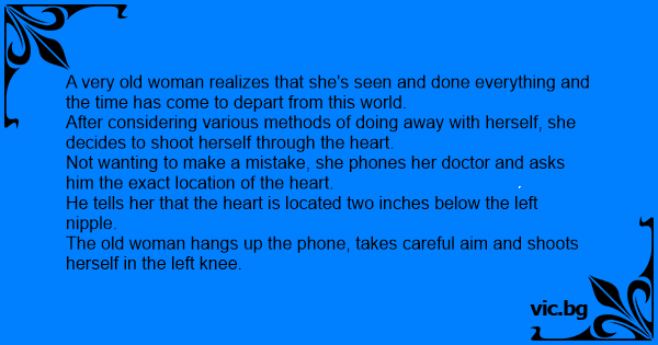 The old woman hangs up the phone, takes careful aim and shoots herself in the left knee.