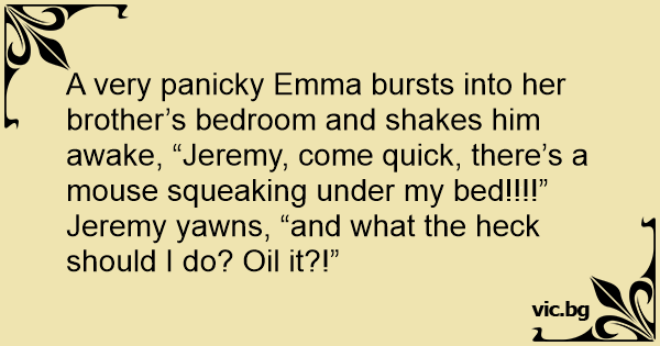 A very panicky Emma bursts into her brother’s bedroom and shakes him awake, “Jeremy, come quick, there’s a mouse squeaking under my bed!!!!”