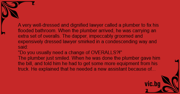 A very well-dressed and dignified lawyer called a plumber to fix his flooded bathroom. When the plumber arrived, he was carrying an extra set of overalls. The dapper, impeccably groomed and expensively dressed lawyer smirked in a condescending way and said: