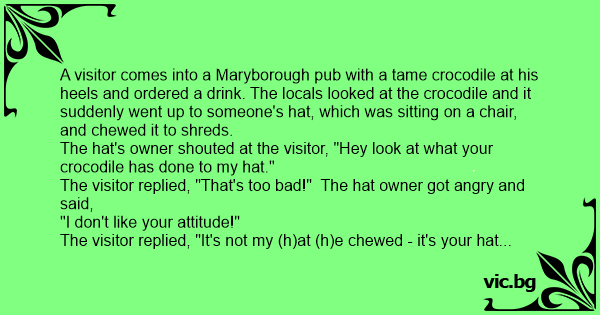 A visitor comes into a Maryborough pub with a tame crocodile at his heels and ordered a drink. The locals looked at the crocodile and it suddenly went up to someone's hat, which was sitting on a chair, and chewed it to shreds.