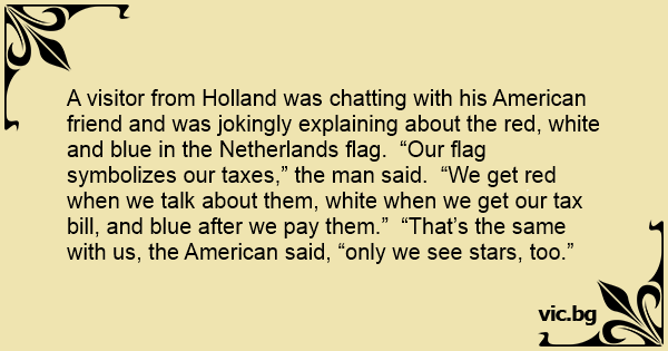 A visitor from Holland was chatting with his American friend and was jokingly explaining about the red, white and blue in the Netherlands flag. “Our flag symbolizes our taxes,” the man said. “We get red when we talk about them, white when we get our tax bill, and blue after we pay them.” “That’s the same with us, the American said, “only we see stars, too.”