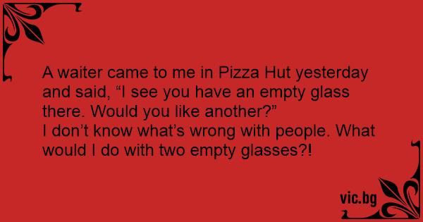 A waiter came to me in Pizza Hut yesterday and said, “I see you have an empty glass there. Would you like another?”