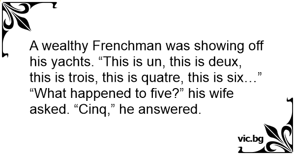 A wealthy Frenchman was showing off his yachts. “This is un, this is deux, this is trois, this is quatre, this is six…”