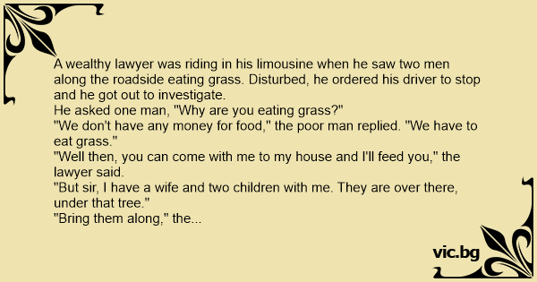 A wealthy lawyer was riding in his limousine when he saw two men along the roadside eating grass. Disturbed, he ordered his driver to stop and he got out to investigate.