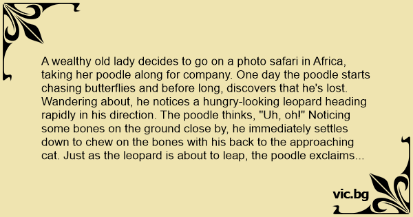 Wandering about, he notices a hungry-looking leopard heading rapidly in his direction. The poodle thinks, "Uh, oh!" Noticing some bones on the ground close by, he immediately settles down to chew on the bones with his back to the approaching cat. Just as the leopard is about to leap, the poodle exclaims loudly, "Boy, that was one delicious leopard! I wonder if there are any more around here?" Hearing this, the leopard halts his attack in mid-strike, a look of terror comes over him and he slinks away into the trees. "Whew!" says the leopard. "That was close! That poodle nearly had me!" Meanwhile, a monkey who had been watching the whole scene from a nearby tree, figures he can put this knowledge to good use and trade it for protection from the leopard. So off he goes, but the poodle sees him heading after the leopard with great speed, and figures that something must be up. The monkey soon catches up with the leopard, spills the beans and strikes a deal for himself with the leopard. The leopard is furious at being made a fool of and says, "Here, monkey, hop on my back so you can watch me chew that poodle to bits!" Now, the poodle sees the leopard coming with the monkey on his back and thinks, "What am I going to do now?" but instead of running, the dog sits down with his back to his attackers, pretending he hasn't seen them yet, and waits until they get just close enough to hear. "Where's that dамn monkey?" the poodle says. "I sent him off an hour ago to bring me another leopard!"