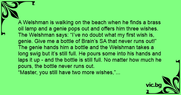A Welshman is walking on the beach when he finds a brass oil lamp and a genie pops out and offers him three wishes.