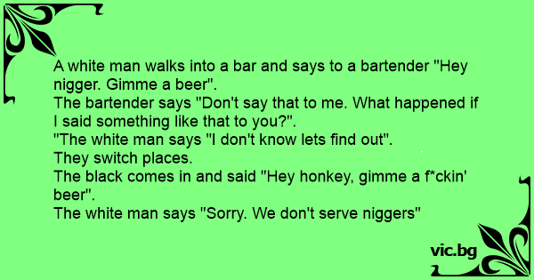 A white man walks into a bar and says to a bartender "Hey niggеr. Gimme a вееr".