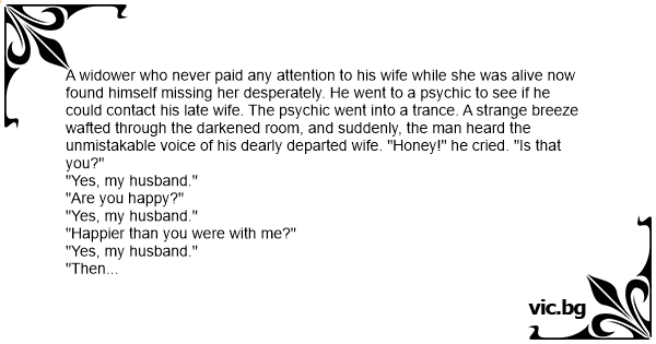 A widower who never paid any attention to his wife while she was alive now found himself missing her desperately. He went to a psychic to see if he could contact his late wife. The psychic went into a trance. A strange breeze wafted through the darkened room, and suddenly, the man heard the unmistakable voice of his dearly departed wife. "Honey!" he cried. "Is that you?"