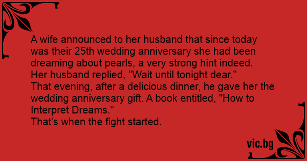 A wife announced to her husband that since today was their 25th wedding anniversary she had been dreaming about pearls, a very strong hint indeed.