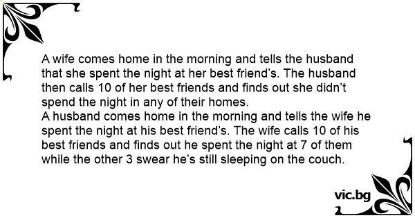 A wife comes home in the morning and tells the husband that she spent the night at her best friend’s. The husband then calls 10 of her best friends and finds out she didn’t spend the night in any of their homes.