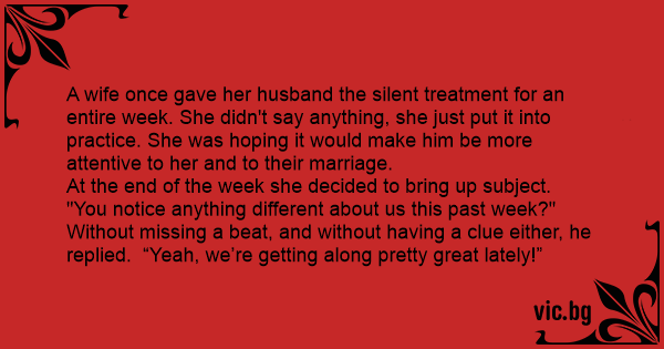 A wife once gave her husband the silent treatment for an entire week. She didn't say anything, she just put it into practice. She was hoping it would make him be more attentive to her and to their marriage.